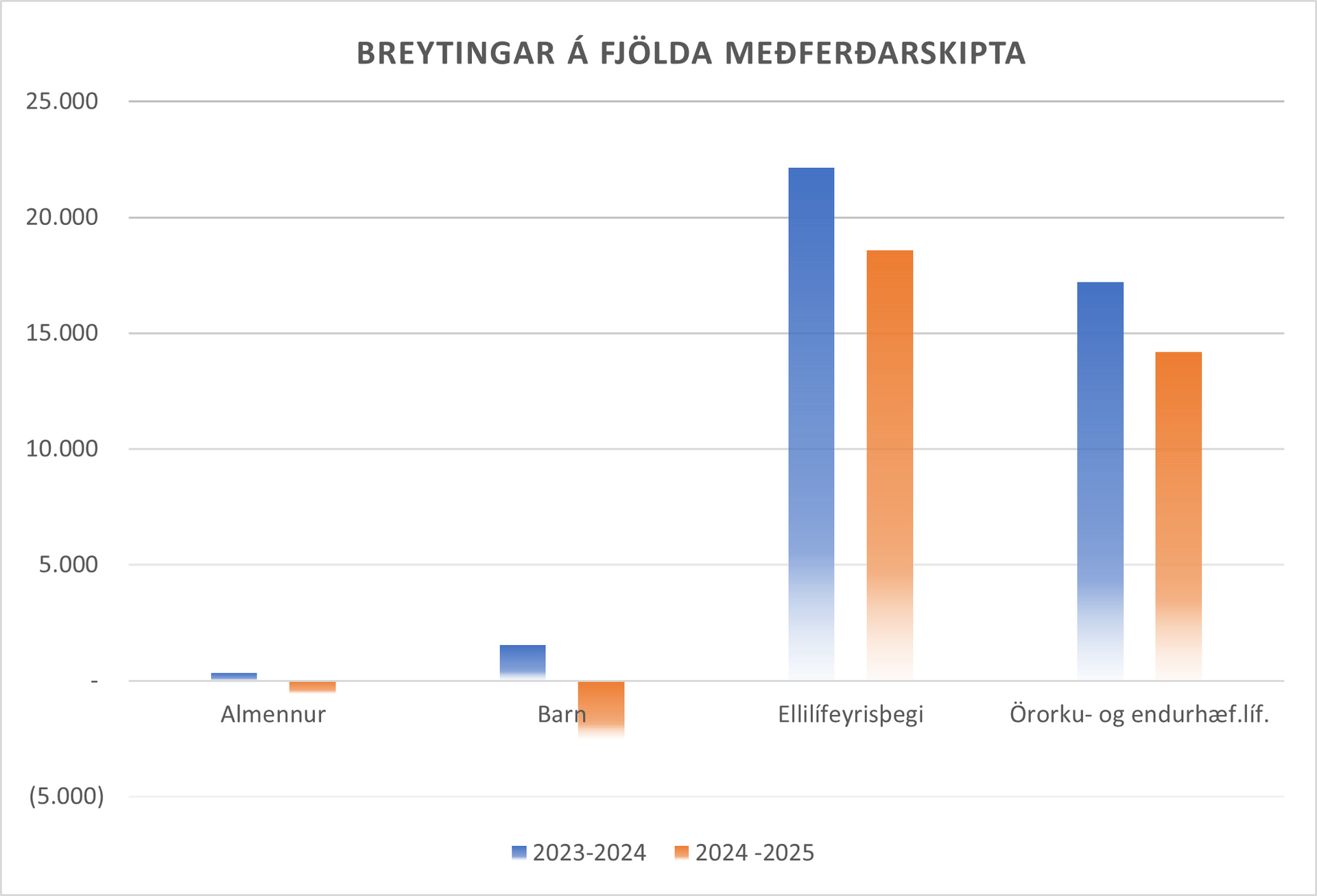 Til samanburðar þá var mun minni fjölgun einstaklinga milli áranna 2024 og 2025, eða rétt tæplega fimmtánhundruð. Þessi breyting skýrist helst af minni fjölgun þeirra sem falla undir almenna hópa samfélagsins. Því er nánast öll fjölgun einstaklinga á tímabilinu hjá þeim sem voru á ellilífeyri eða örorku- eða endurhæfingarlífeyri.